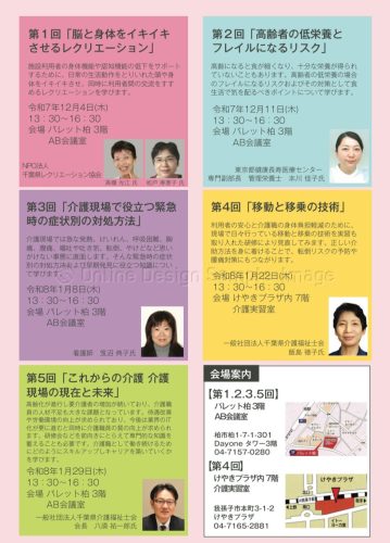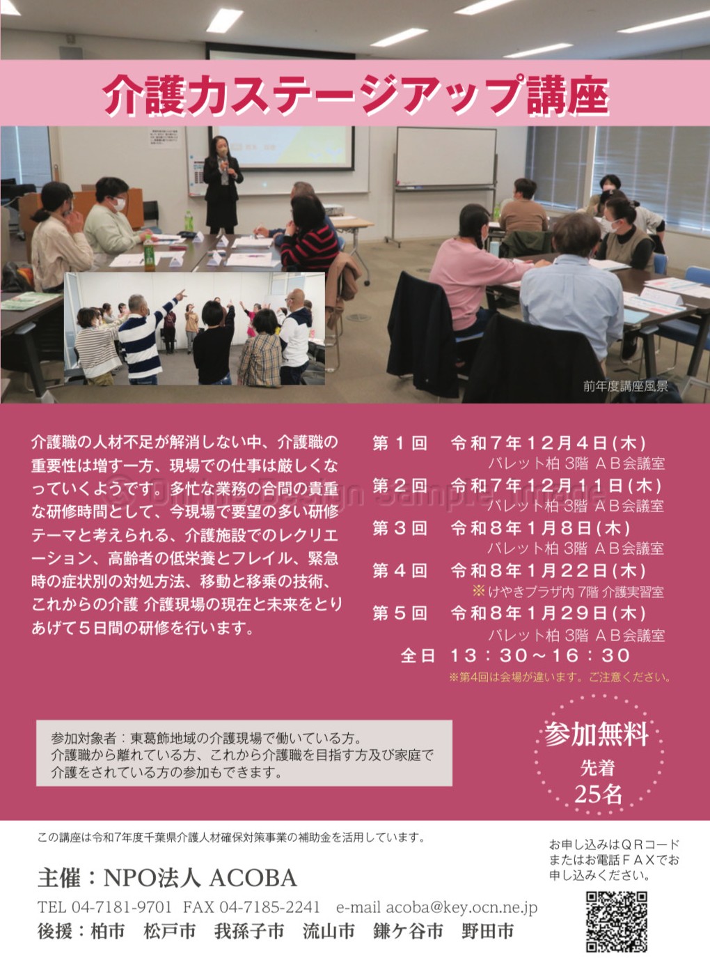 今年度も東葛飾地域の介護職、介護に関心のある方を対象に、介護力のステージアップを図る講座を開催いたします。